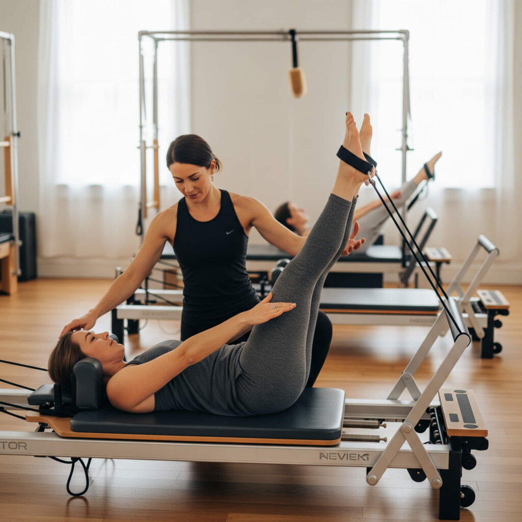 Si nunca lo has practicado, comienza con Pilates Mat en clases para principiantes. Es la forma más accesible y progresiva.